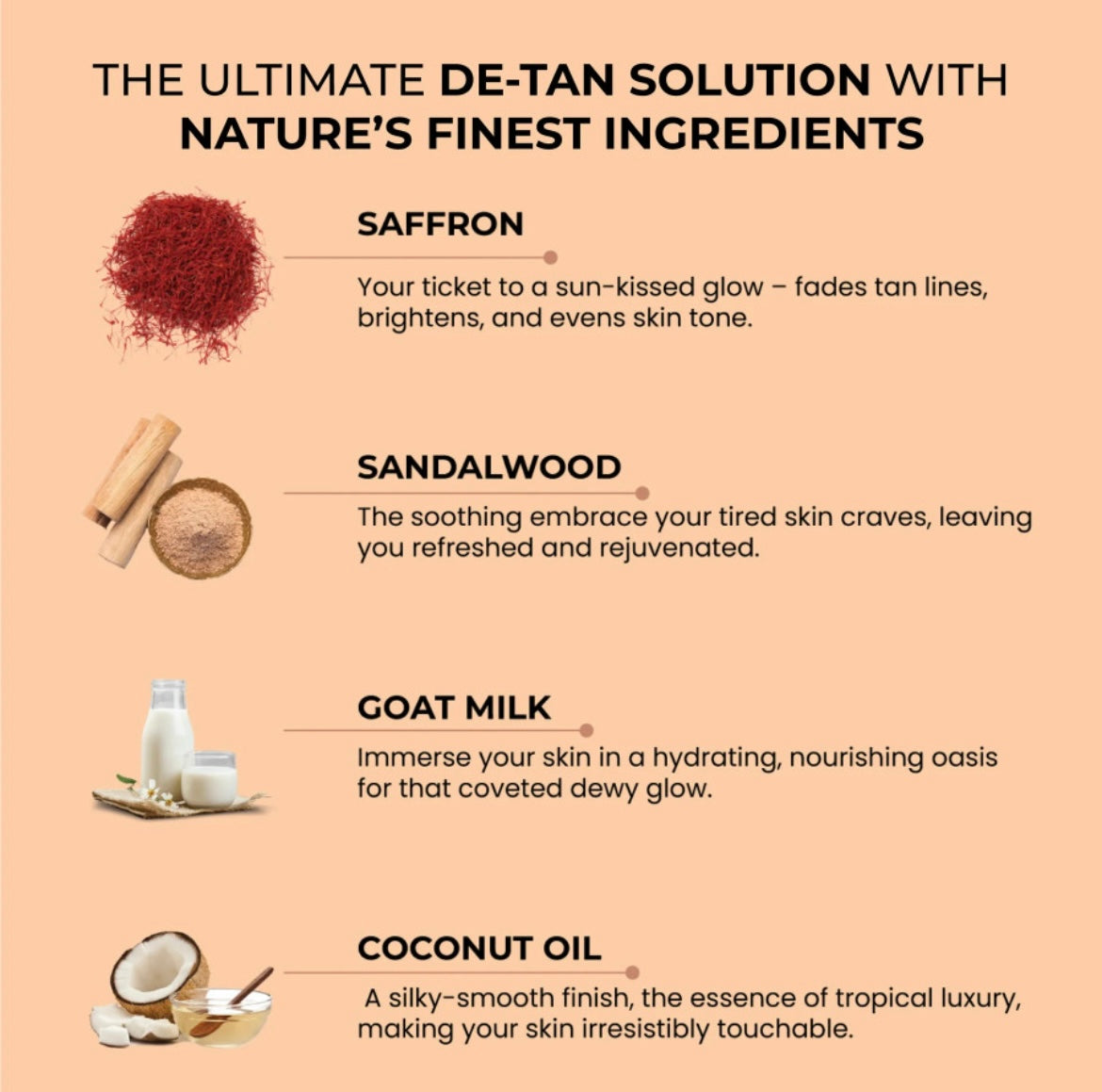Key Features - De-tan soap bar for clean, fresh, bright and glowing skin, Enriched with the goodness of sandalwood and saffron, Helps to deeply clean pores and remove dirt and grime, Helps to reduce scars, dark spots, and sun spots and neutralize skin pigmentation, Suitable for all skin types, This product is free from harmful chemicals